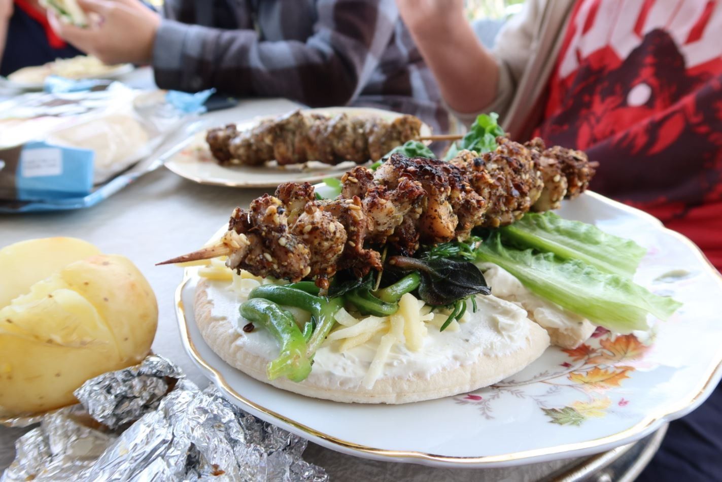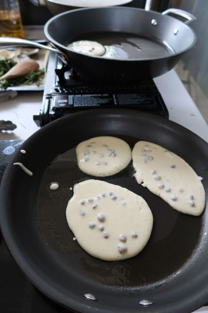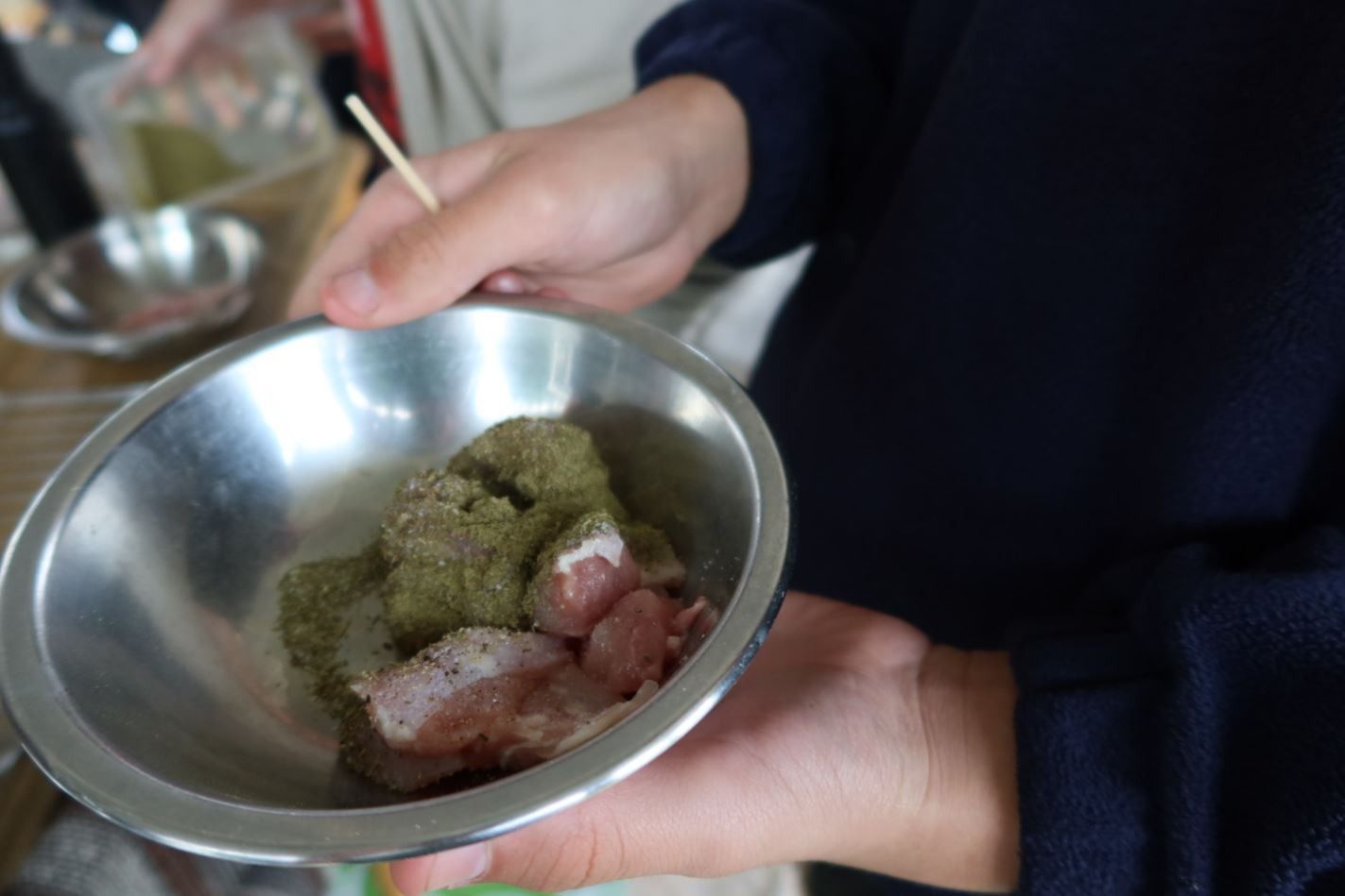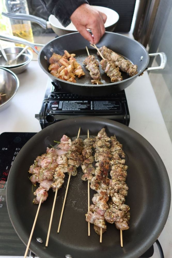 After the nursery tour, we came back to my place and I took them on a garden tour, highlighting the myrtles growing, saltbush, muntries, and the seasonal vegetables in the garden. After the tour and a chat with the chooks, we got into making lunch. I brought out all the different ingredients they could add to their chicken and skewer them to make their chicken souvlakis with bush greens. They did a fabulous job. After that, we made muntrie pancakes with river mint. The junior chefs worked hard and did such a great job.